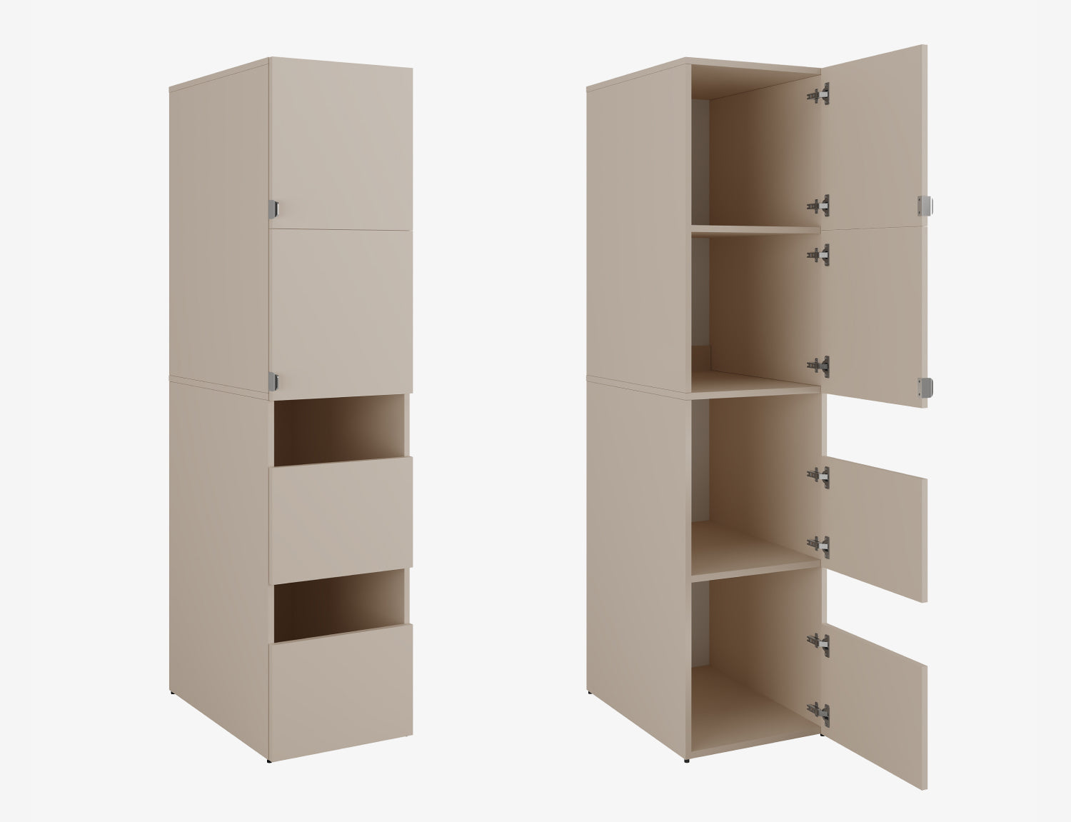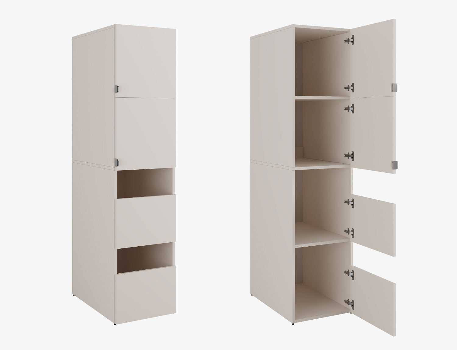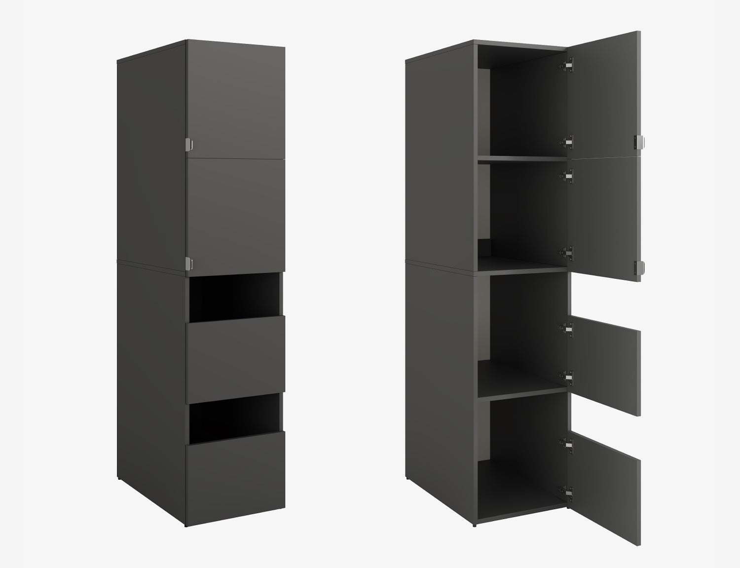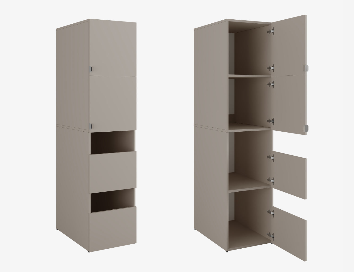 Ja, beide Modelle wurden als ergänzendes Set entworfen. Sie haben die gleiche Höhe (187 cm) und Tiefe (65 cm), sodass sie nebeneinander eine kohärente und ästhetische Modulbauweise bilden.