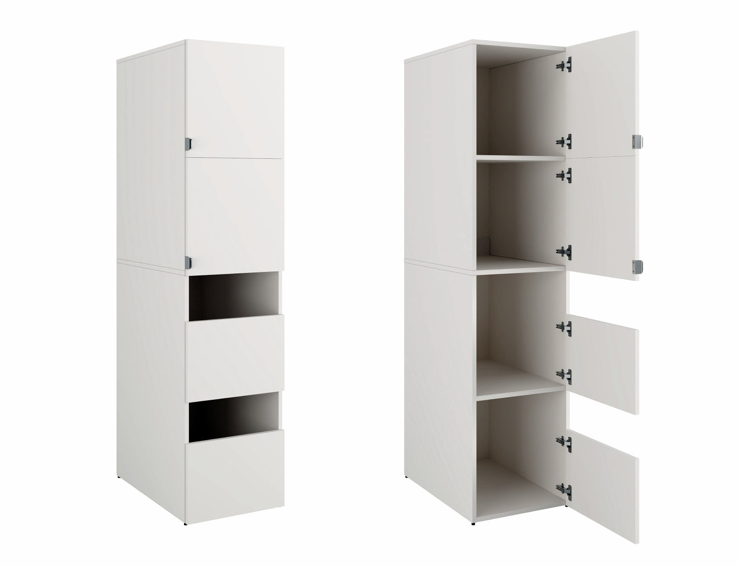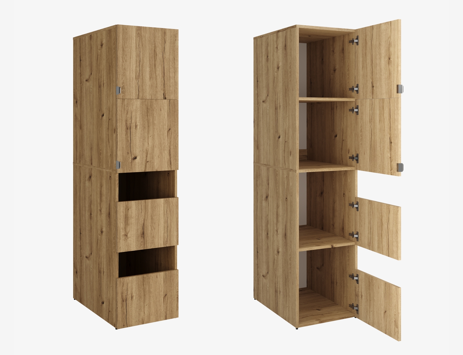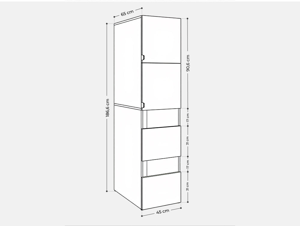 • Platzsparend – mit einer Breite von 45 cm passt der Schrank auch in schmale Nischen und bietet gleichzeitig viel Stauraum im Inneren.