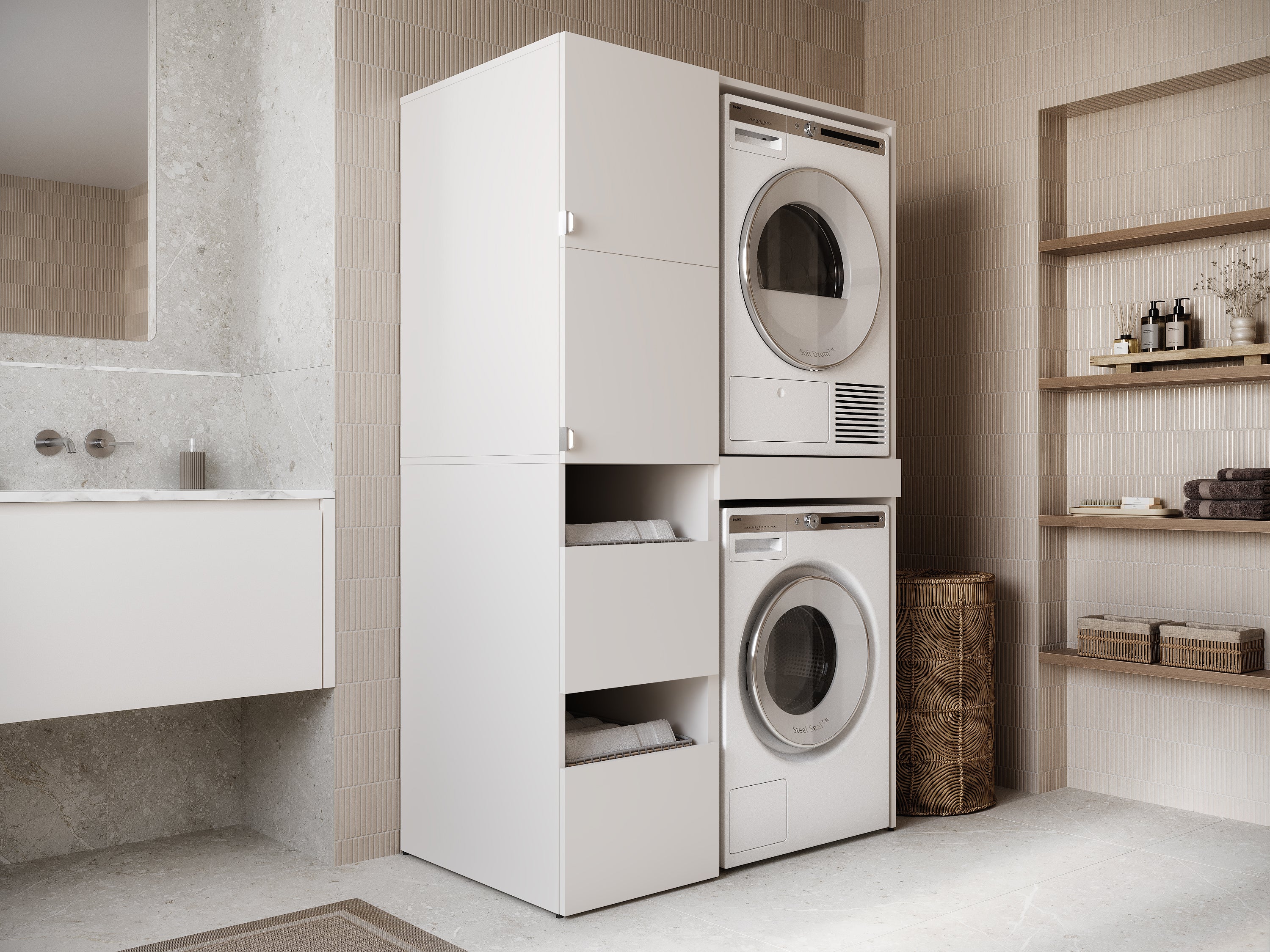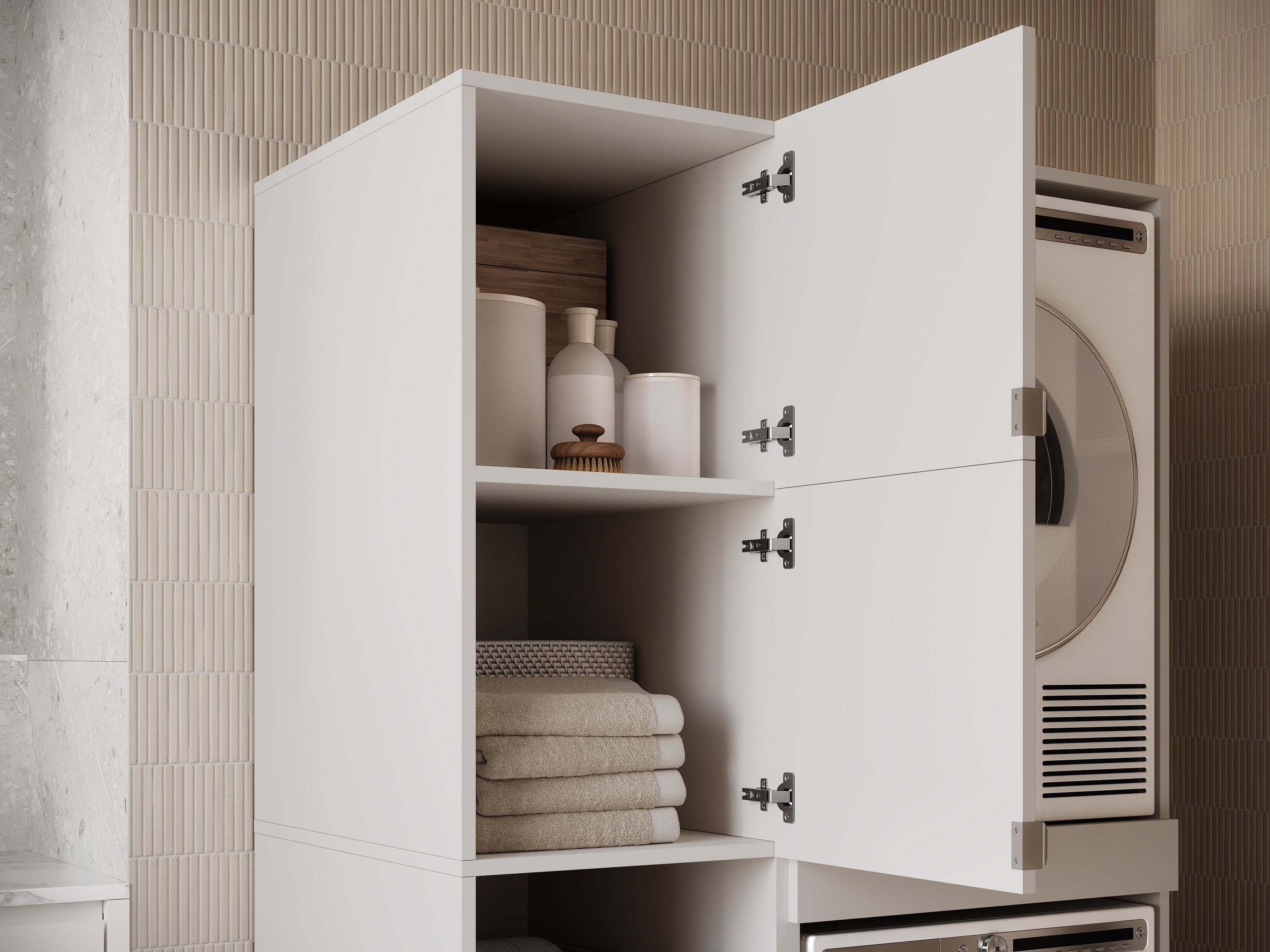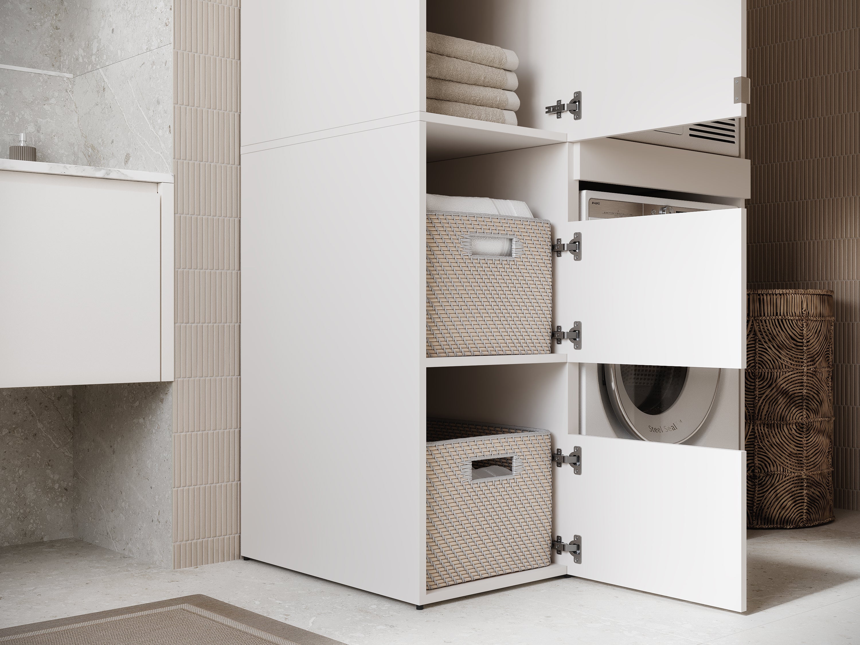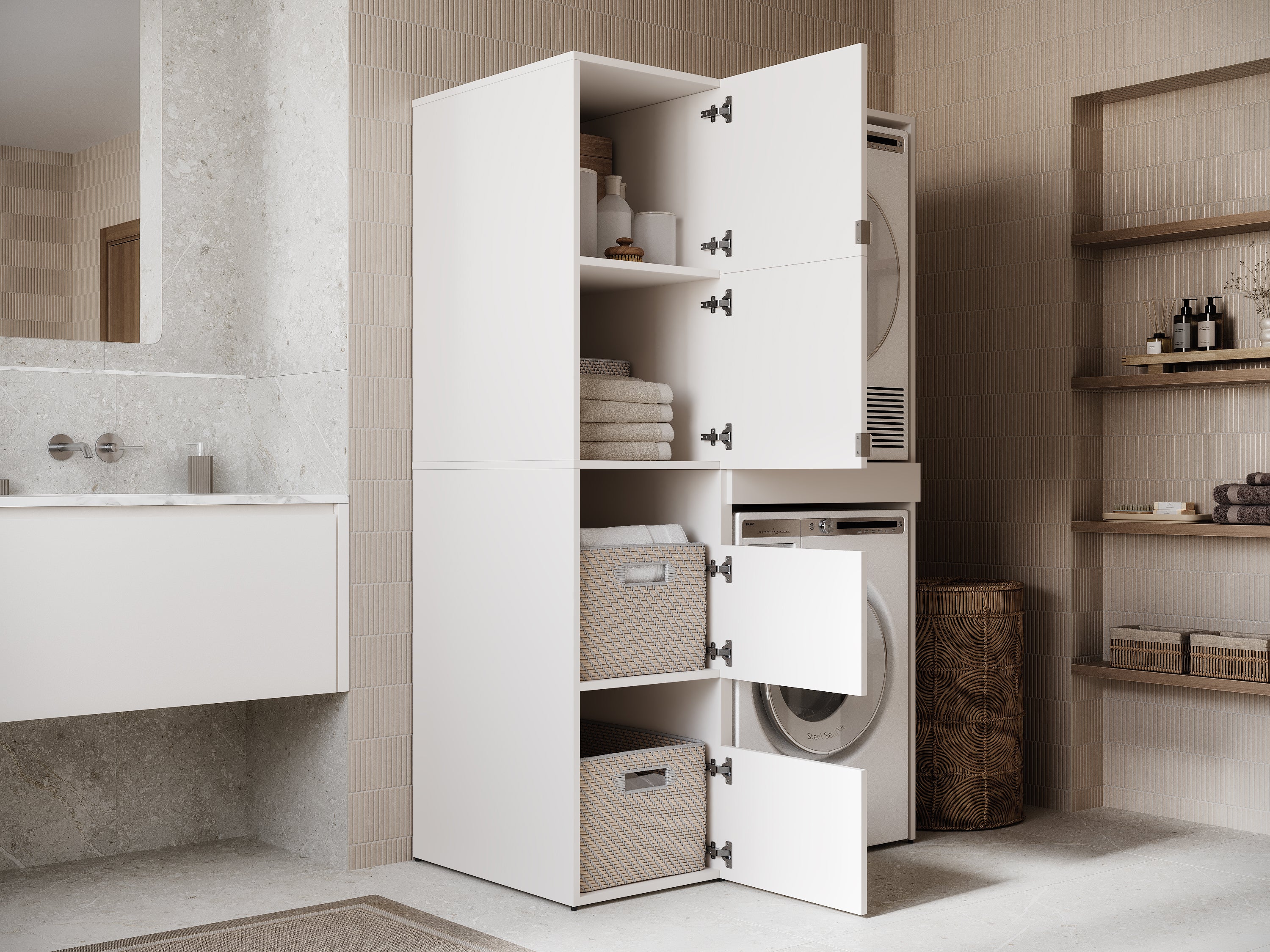 Wichtig: Der Schrank BEATRICE wurde als ideale Ergänzung zum Schrank über Waschmaschine und Trockner DANTE entworfen. Beide Modelle haben die gleiche Höhe (187 cm) und Tiefe (65 cm), sodass sie nebeneinander eine einheitliche, elegante und äußerst geräumige modulare Lösung für Ihr Badezimmer oder Ihren Hauswirtschaftsraum bilden.