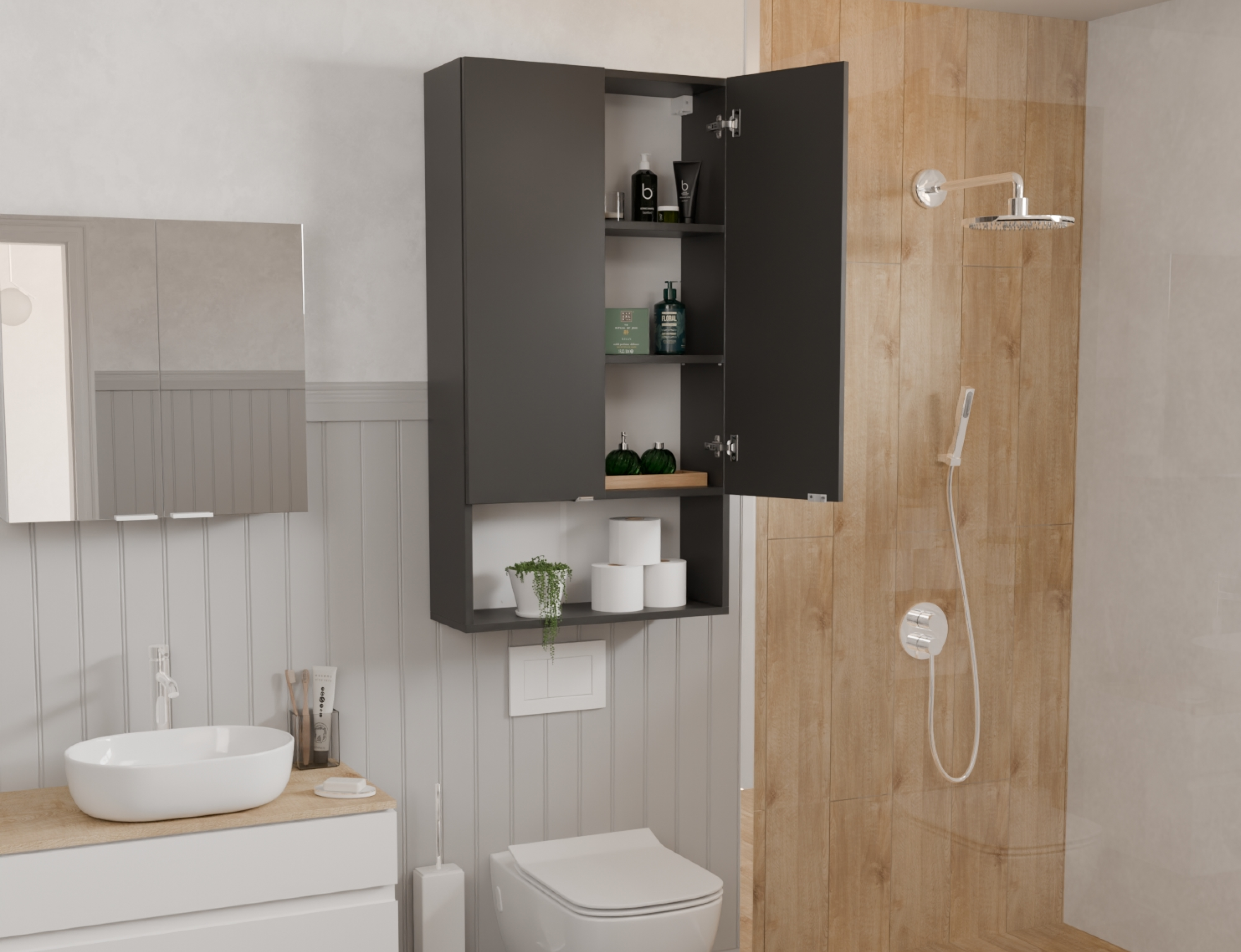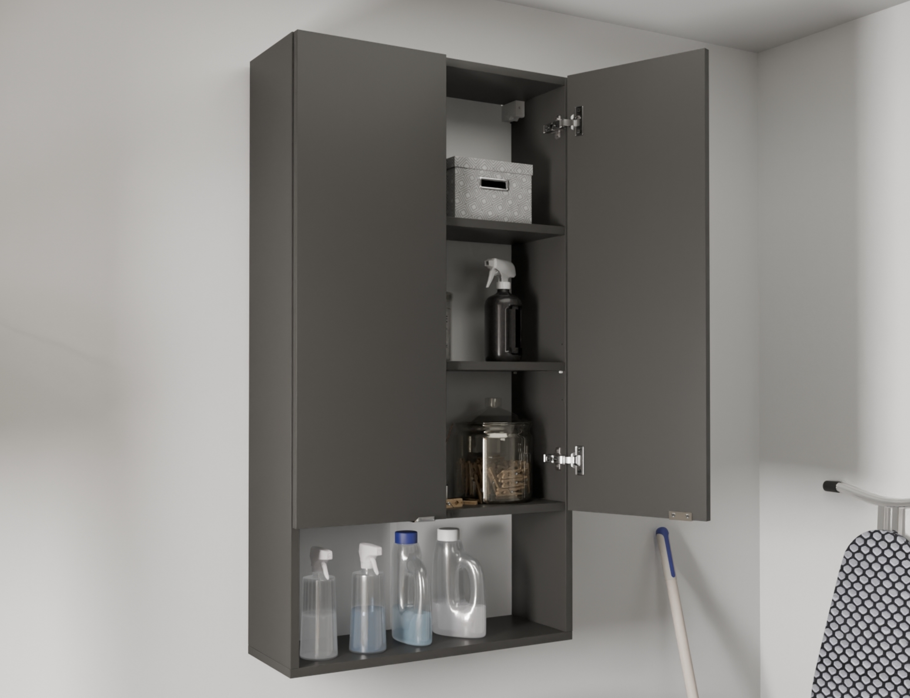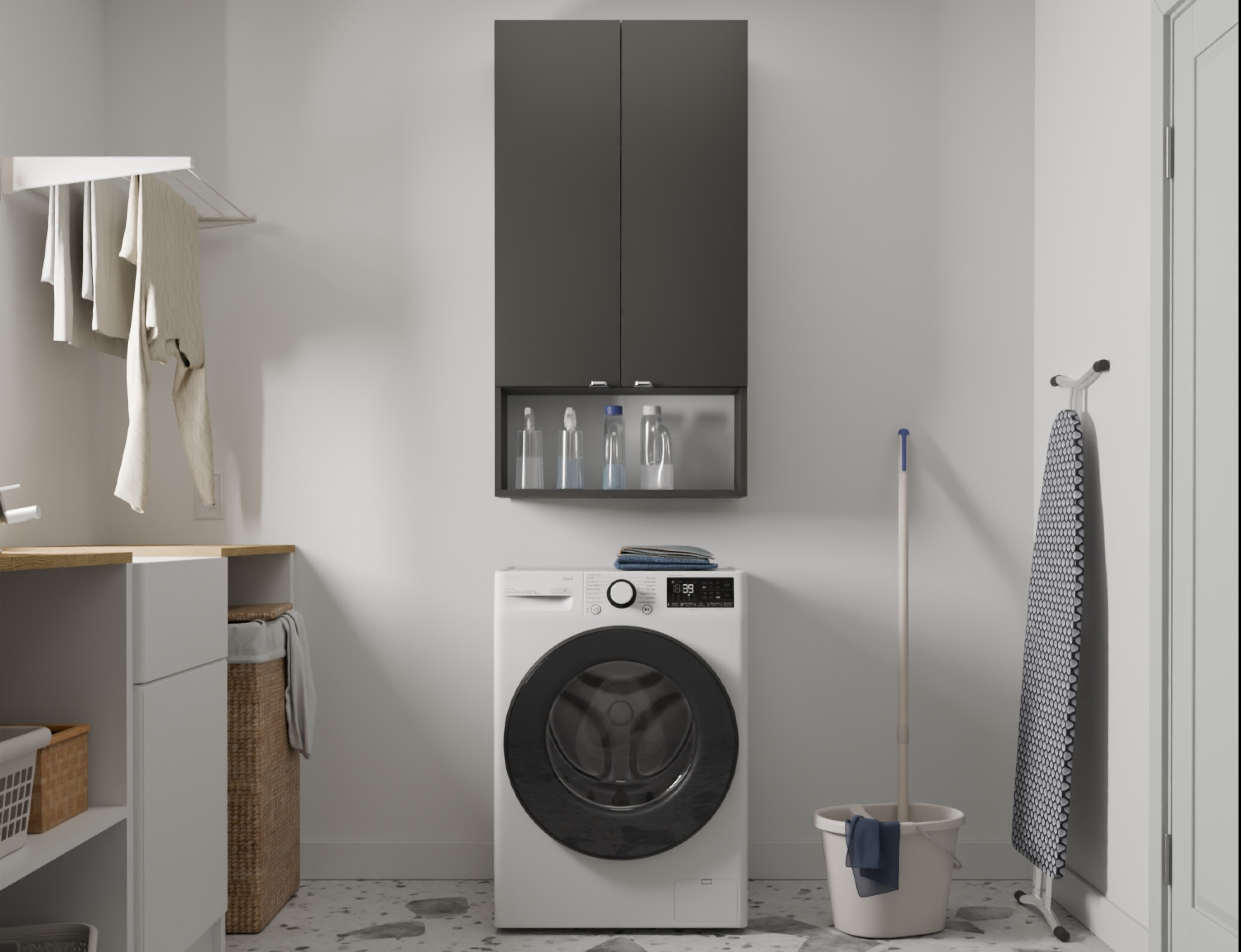 The LORA washing machine cabinet is a practical solution for any bathroom. 3 shelves behind the door and one open shelf provide convenient storage. Soft Close hinges ensure quiet closing, and adjustable shelves (+/- 6 cm) allow you to adjust the space to your needs.
