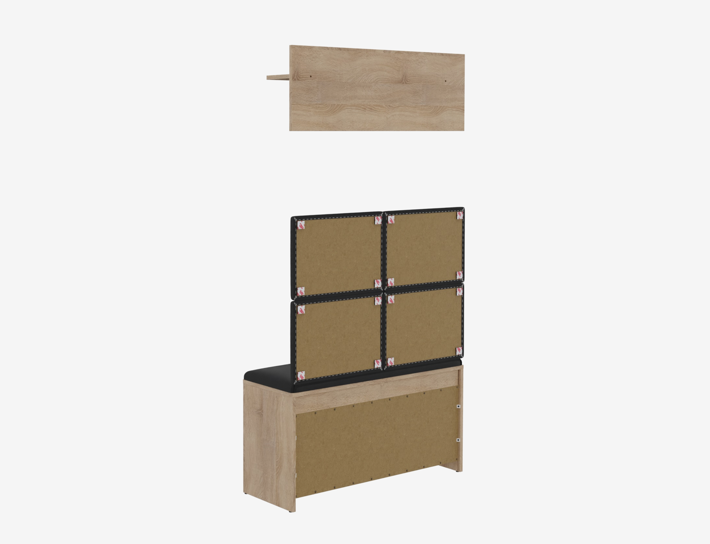 El armario EMI es un conjunto de recibidor sólido, práctico y moderno, fabricado con materiales de la más alta calidad. Incluye un zapatero con asiento, un estante con perchas y paneles de pared tapizados, ofreciendo un espacio de almacenamiento y organización elegante y funcional.