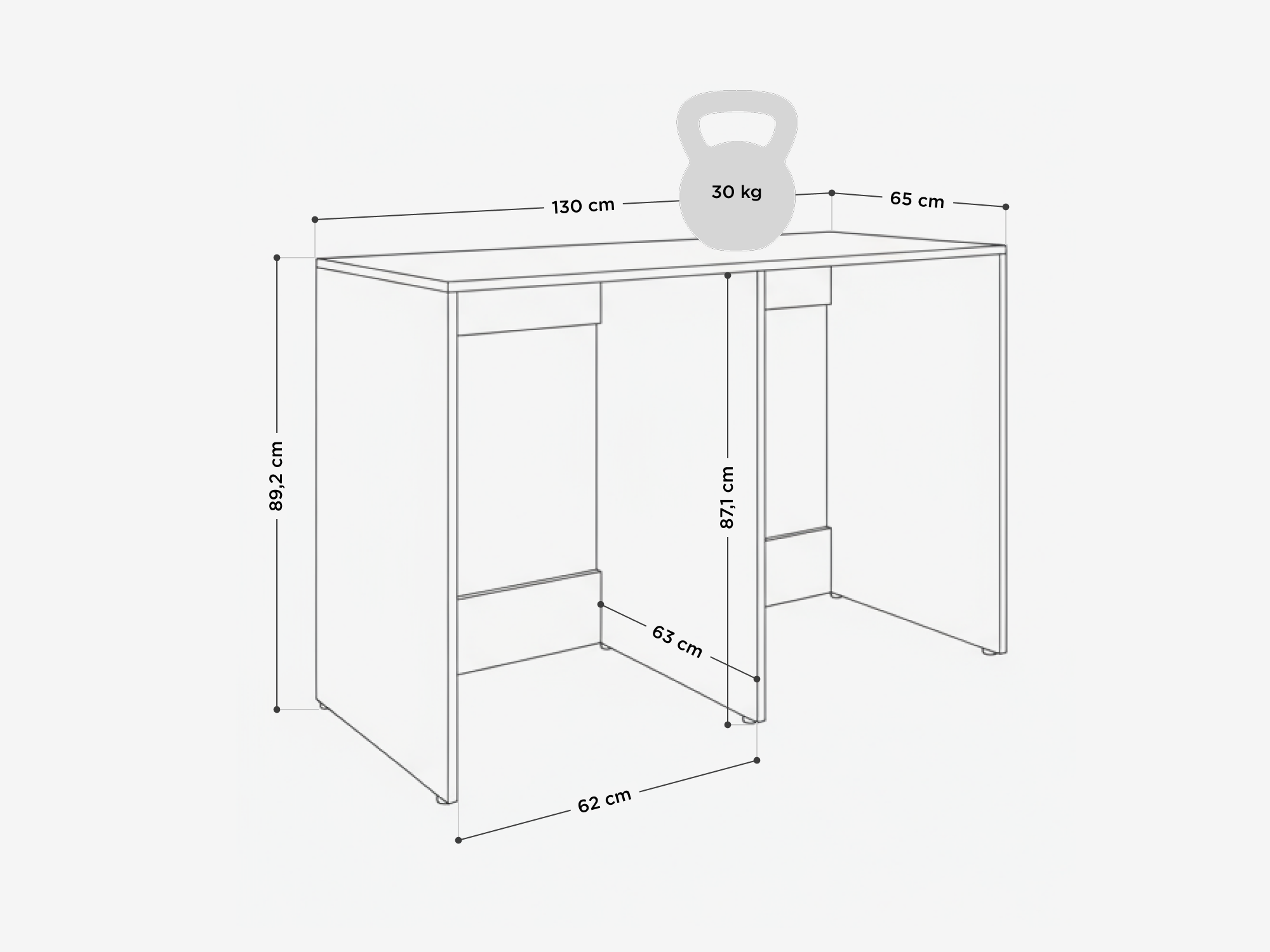 El mueble para lavadora y secadora mide 130 x 90 x 56/65 cm (ancho x alto x profundidad). Es compatible con lavadoras y secadoras estándar.