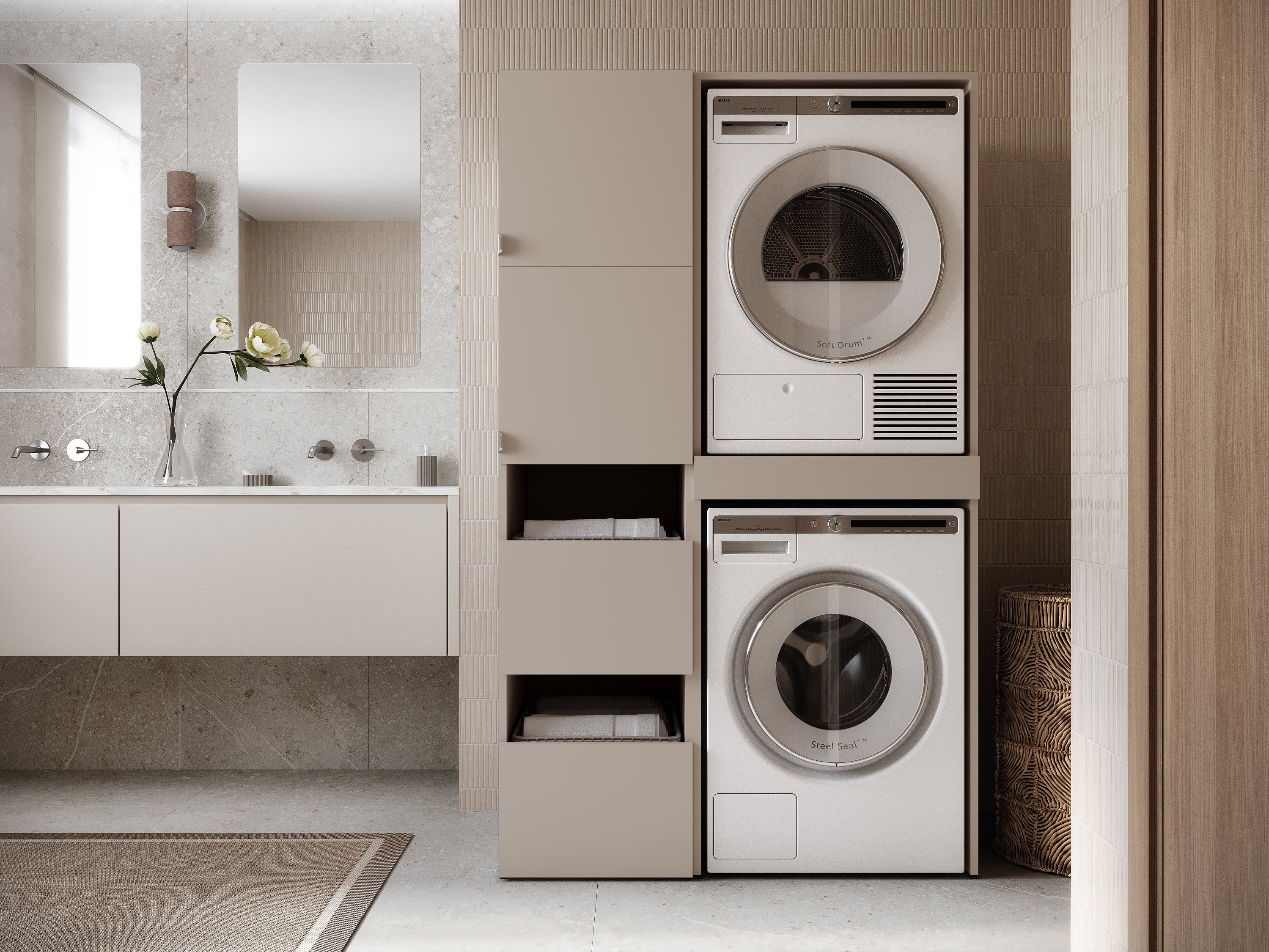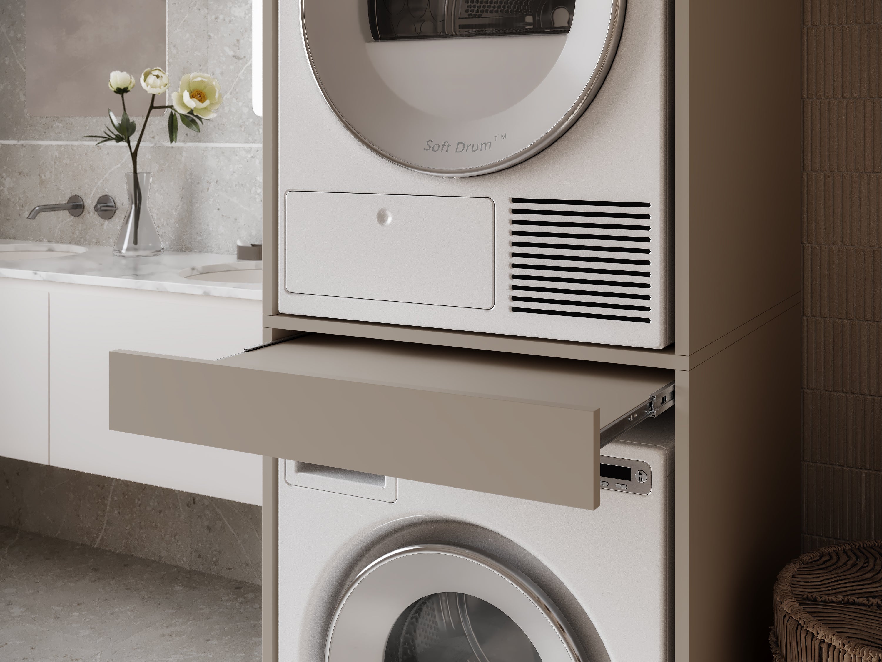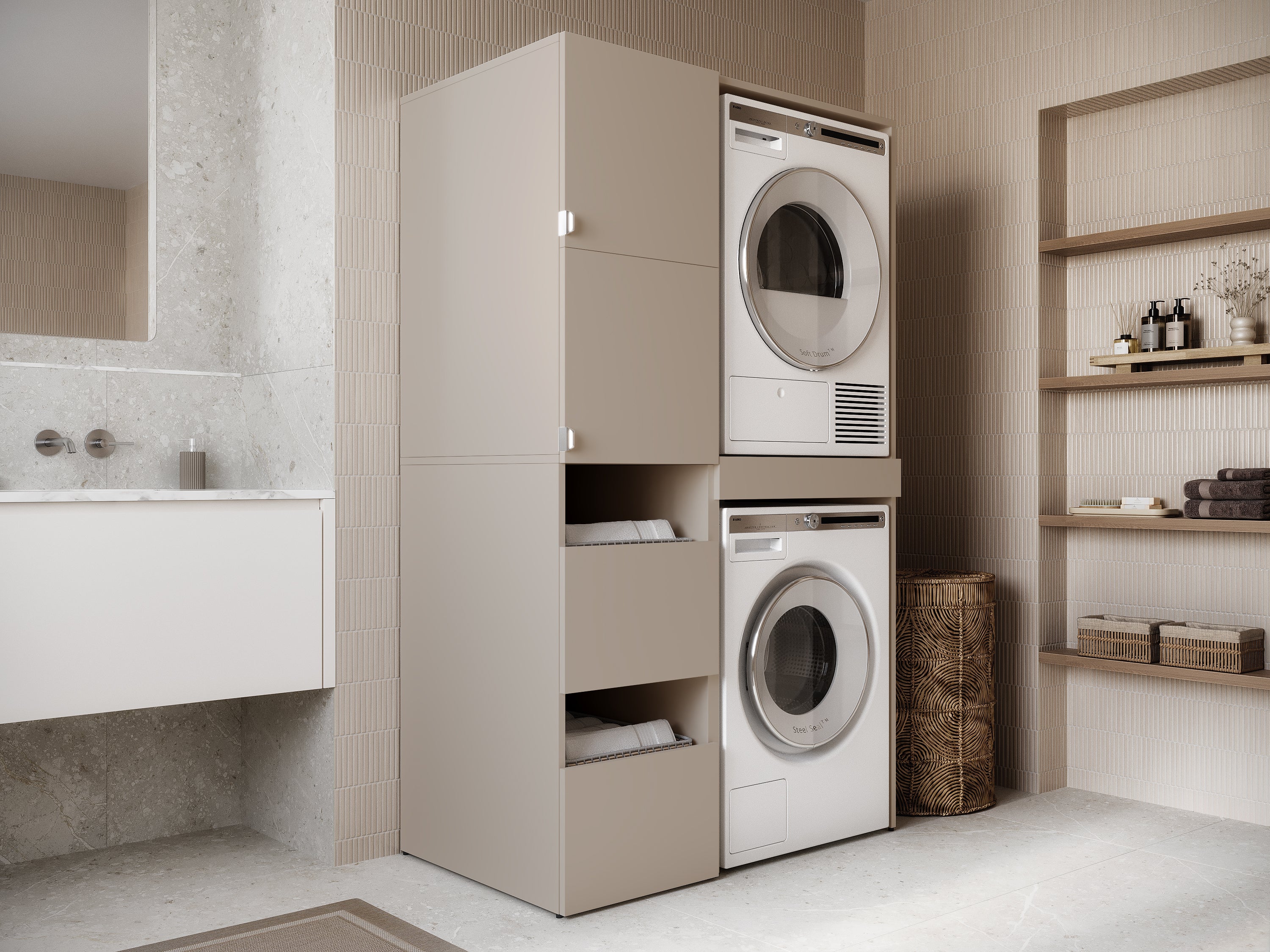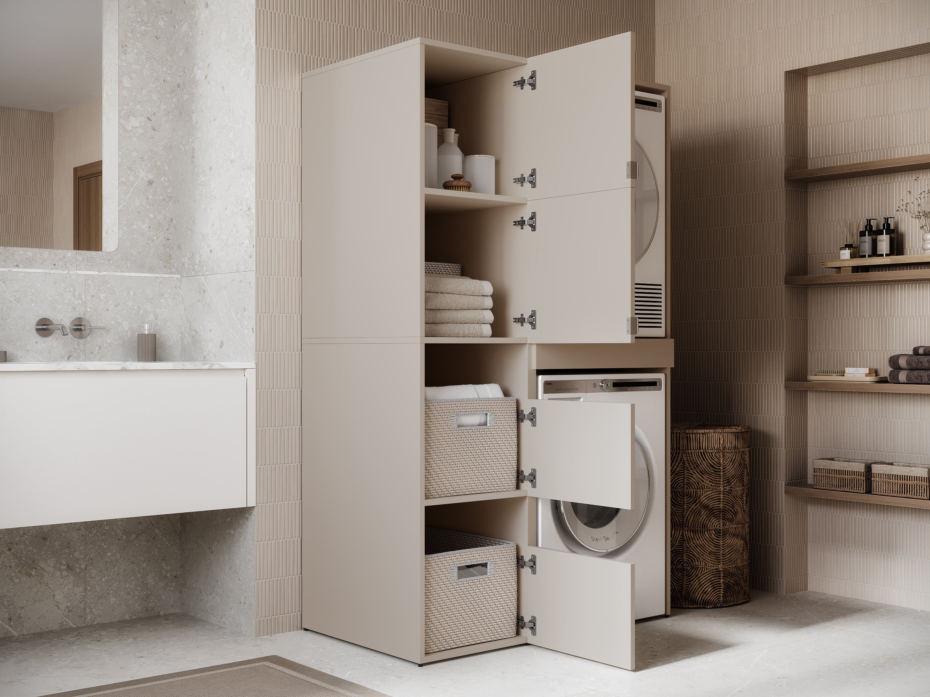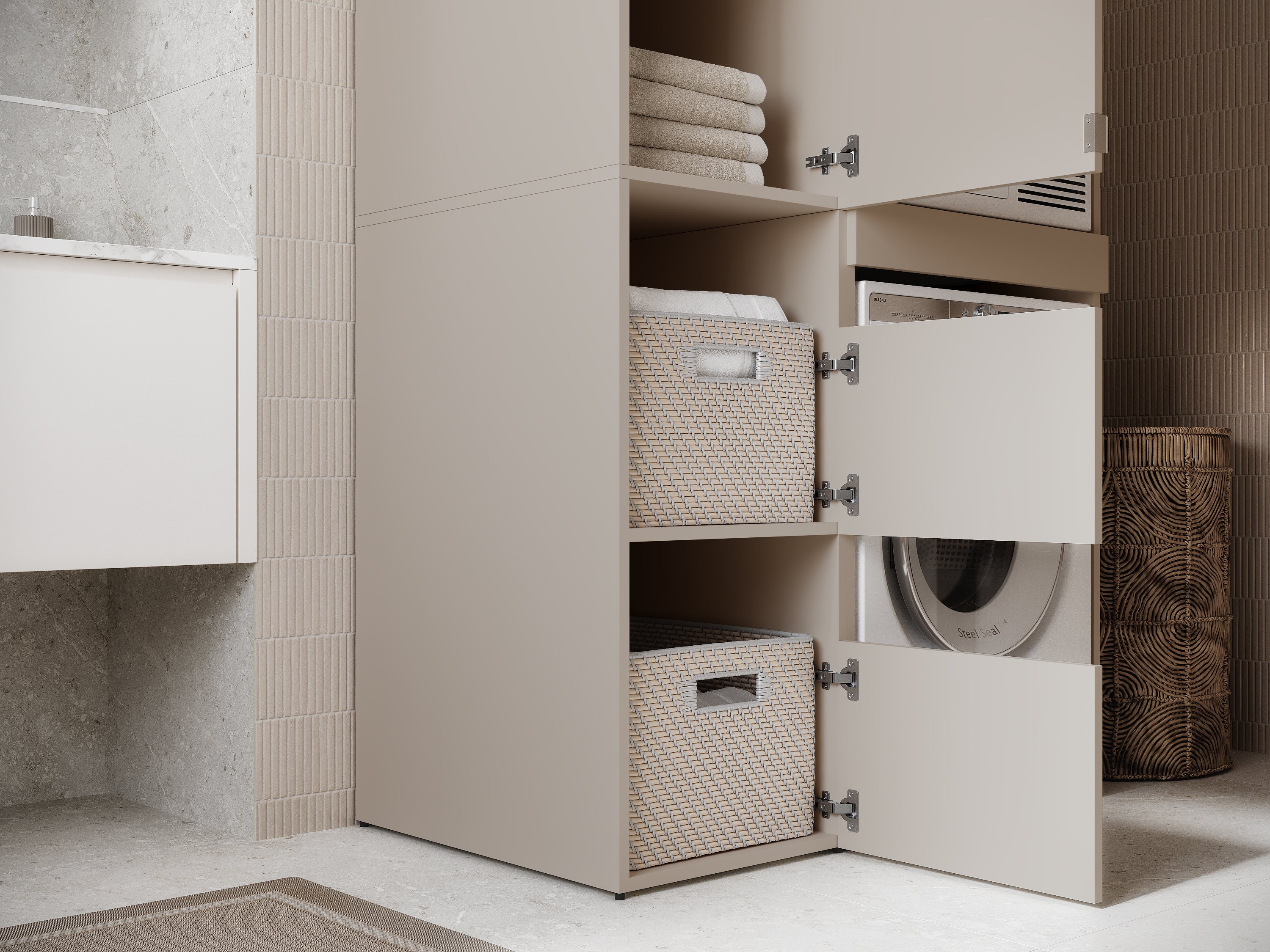Maximale benutting van de ruimte ontmoet minimalistisch design. De set bestaande uit de Dante witgoedkast en de Beatrice waskolomkast is een totaaloplossing voor jouw badkamer. De verticale constructie, de verborgen inwerpopening voor de was en de elegante afwerking maken de dagelijkse taken eenvoudiger en geven je interieur een modern karakter.