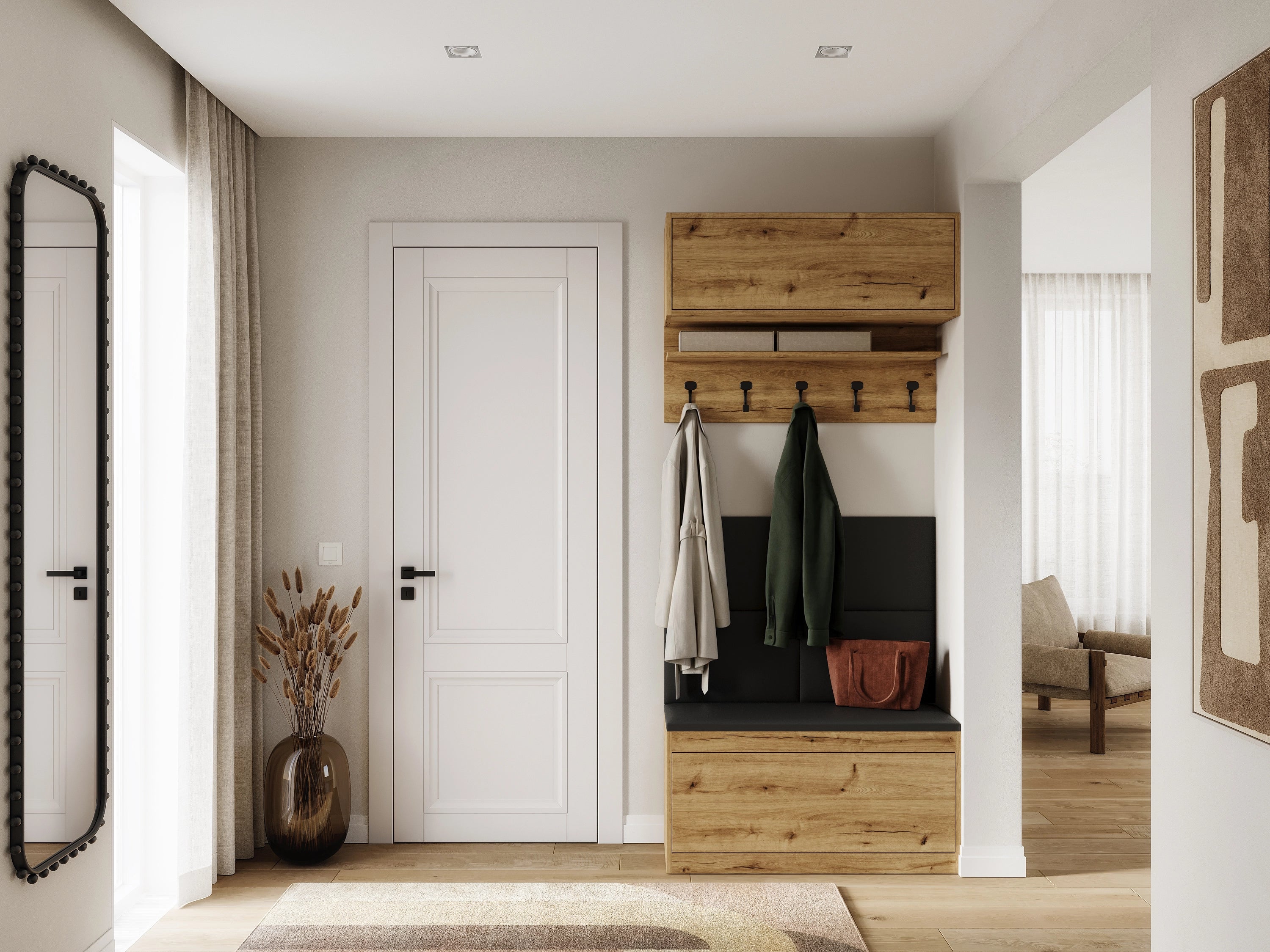 Garderoba EMI to solidny, praktyczny i nowoczesny zestaw do przedpokoju. Zawiera szafkę na buty z siedziskiem, półkę z wieszakami, tapicerowane panele ścienne oraz szafkę wiszącą, zapewniając funkcjonalność i styl. Idealne rozwiązanie do wygodnego przechowywania i organizacji przestrzeni.