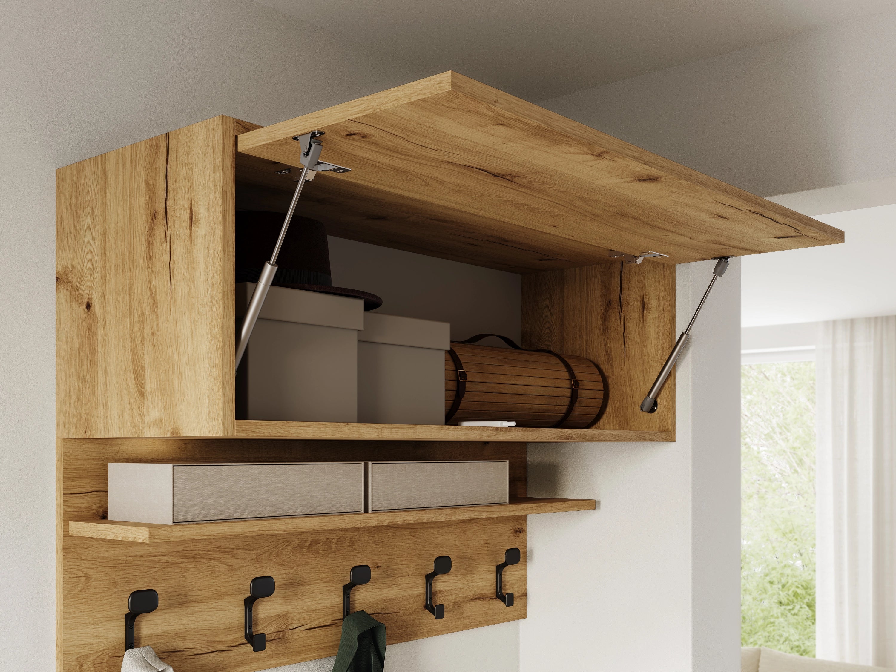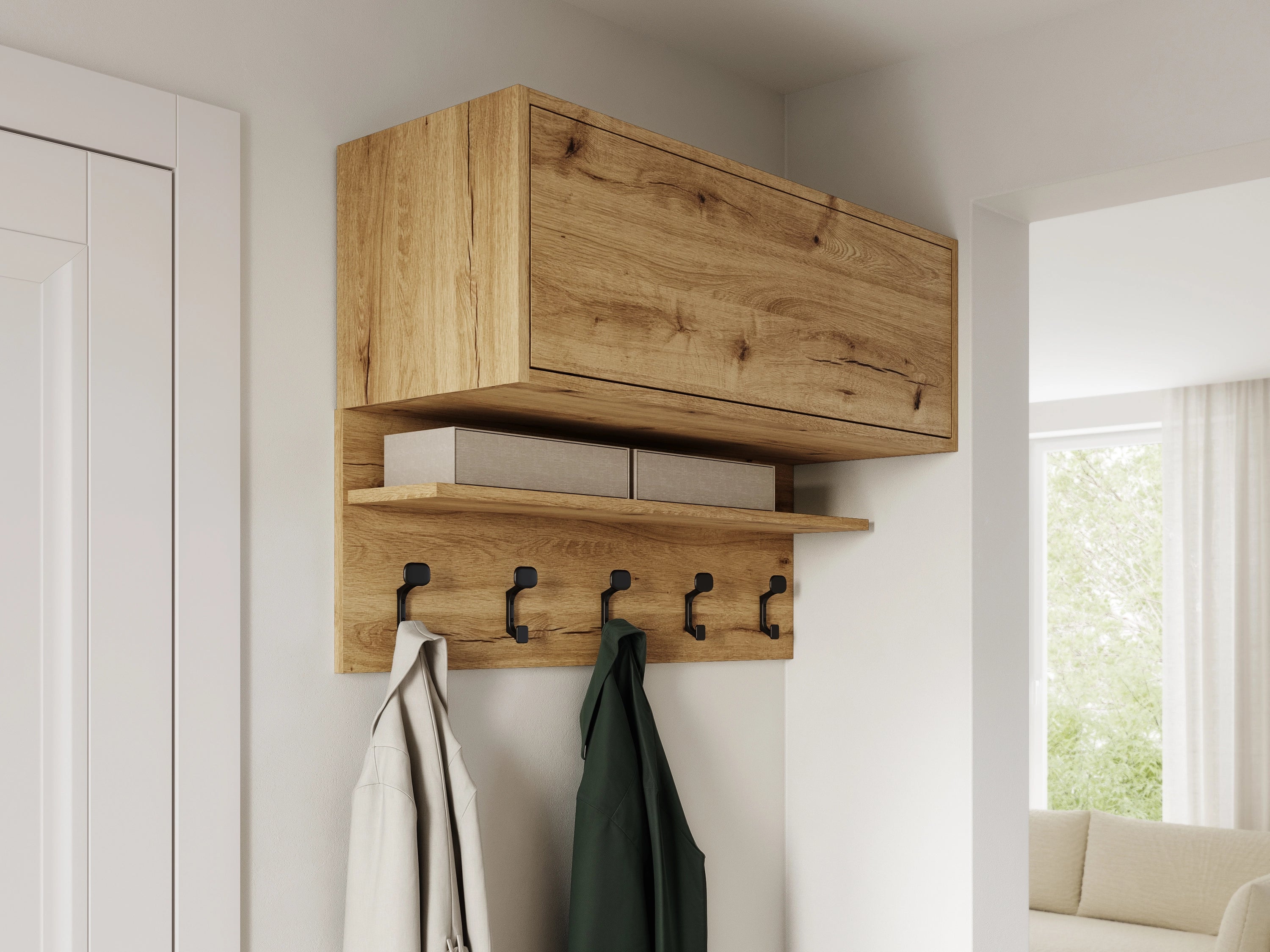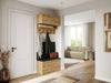 • Garderoba składa się z praktycznego wieszaka z 5 haczykami, wiszącej szafki. szafki na obuwie oraz panele ściennych.