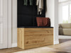 • Całość została wykonana z grubej płyty meblowej 18 mm, a siedzisko w szafce na buty z odpornej na zarysowania skóry ekologicznej.
